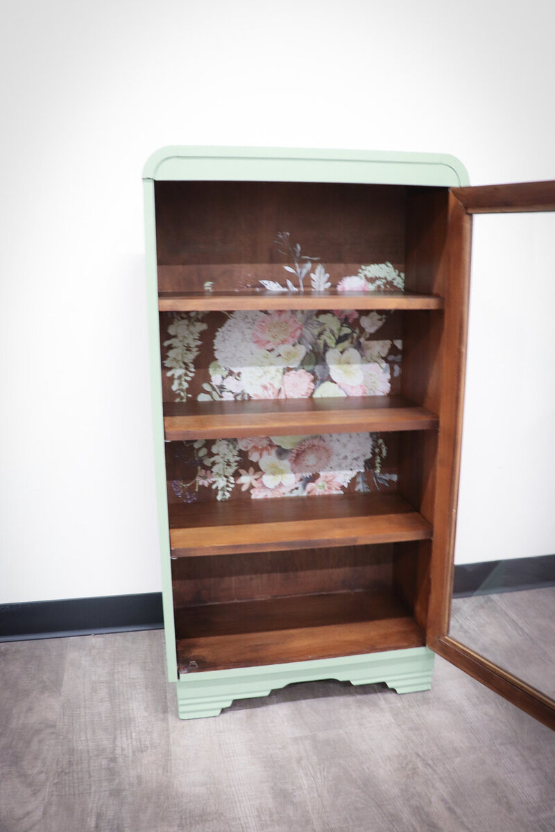a petite vintage glass-door cabinet, its exterior lovingly hand-painted in a soothing sage green hue, reminiscent of lush gardens and tranquility. The delicate strokes of green add a touch of elegance to the cabinet's classic design.