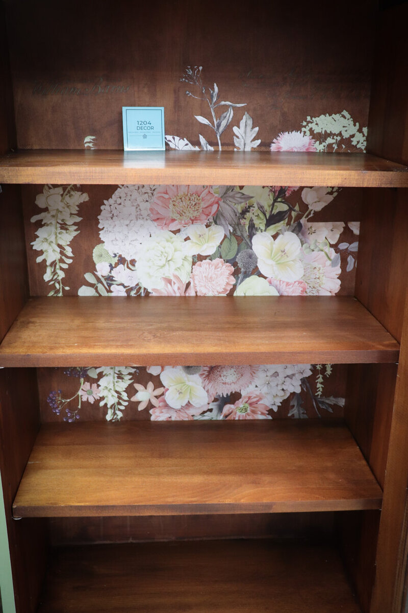 Open the glass doors, and you'll find the interior shelves of the preserved hardwood, showcasing the natural beauty of the wood's grain and texture. This juxtaposition of the sage green exterior and the warm, rich tones of the hardwood creates a delightful contrast, making the cabinet a charming addition to any space. Perfect for displaying treasured trinkets or keepsakes, this mini vintage glass-door cabinet exudes a timeless charm and understated sophistication.