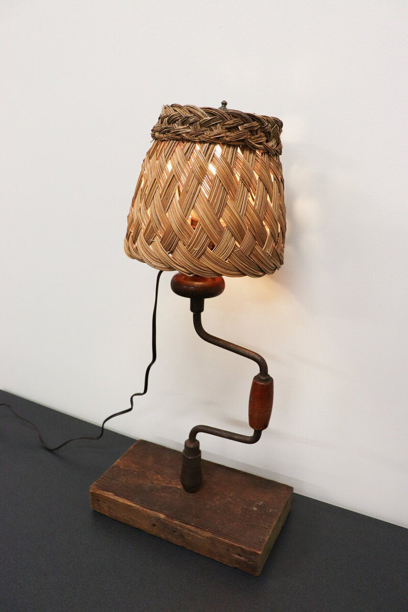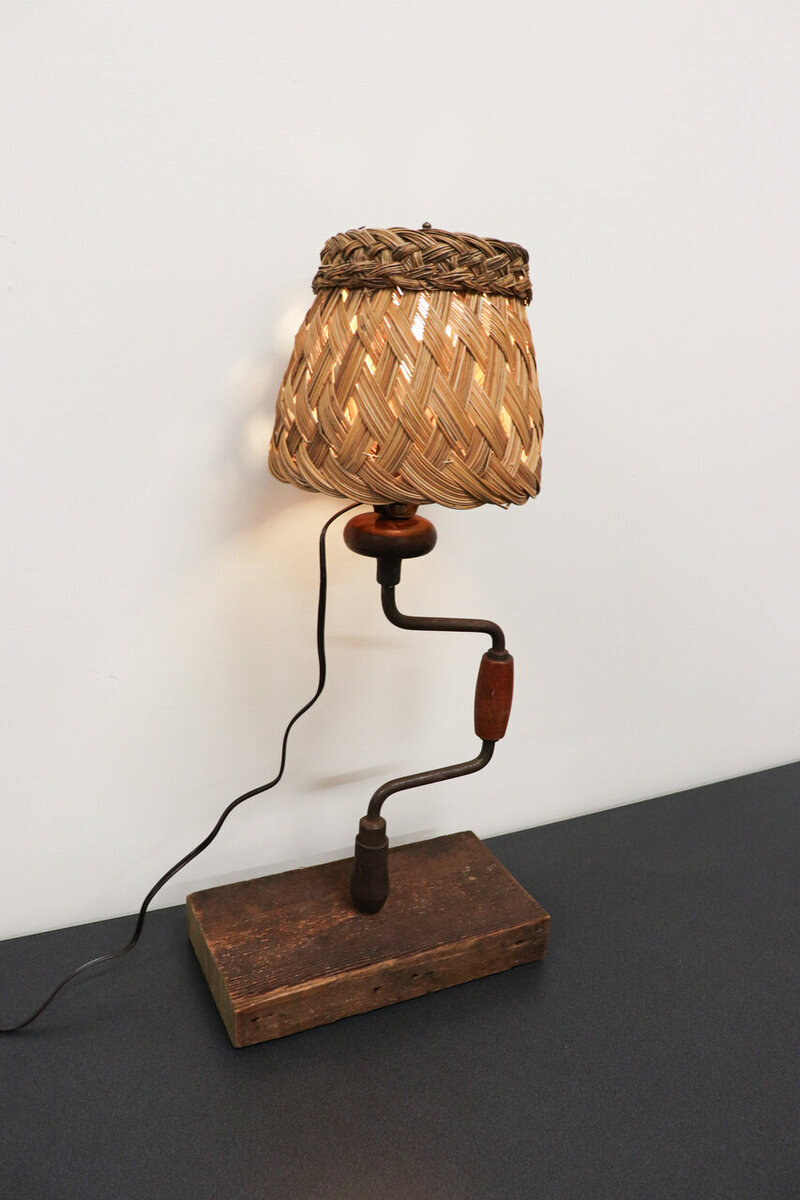 Perched atop this antique handle is a basket, ingeniously repurposed as a lampshade. Woven with care, the basket's natural fibers diffuse the light, casting a warm, gentle glow that illuminates the room with a soft ambiance.