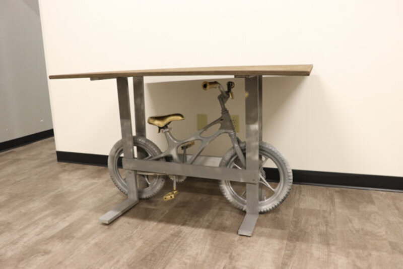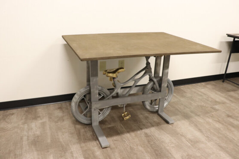 Created by a local homeschool group, this creative standing desk combines a kid's bike for a twist of artistic flair. This bike has been ingeniously transformed into afunctional desk providing a playful and inspiring workspace for your little artist, student, or imaginative thinker!