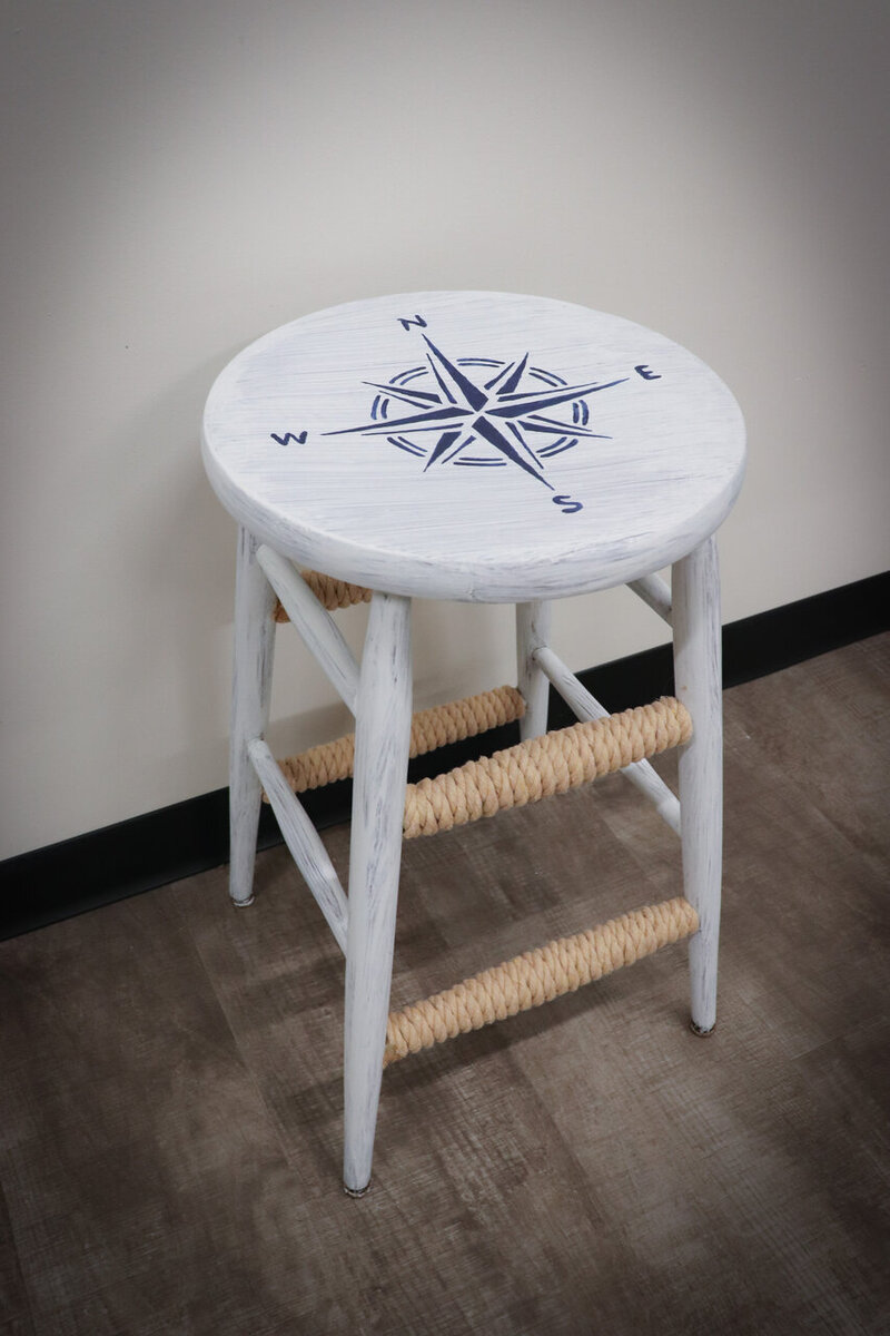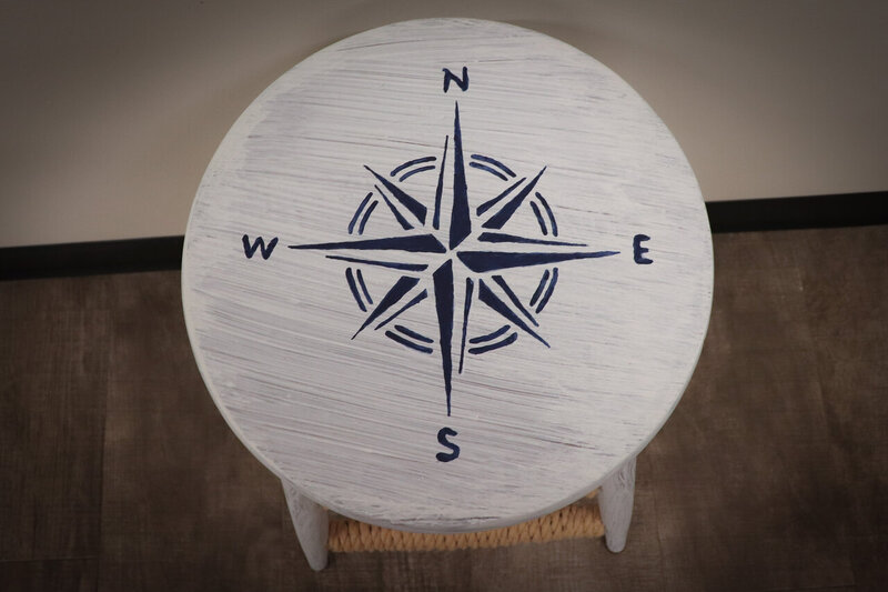 At the top of the stool, a navy blue compass rose takes center stage, its intricate design pointing towards the cardinal directions with precision and grace. The deep blue hue of the compass contrasts beautifully against the stool's natural wooden surface, creating a striking focal point that draws the eye.