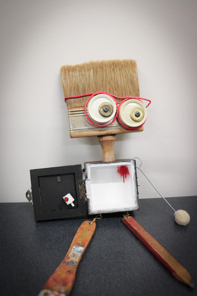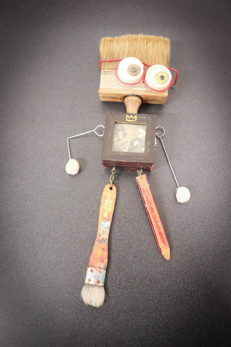 Picture a unique handcrafted figure, born from the creative mind and inspired by the artistic spirit of Jean-Michel Basquiat. This inventive creation is crafted primarily from a repurposed paint brush, embracing the essence of recycling and creativity.