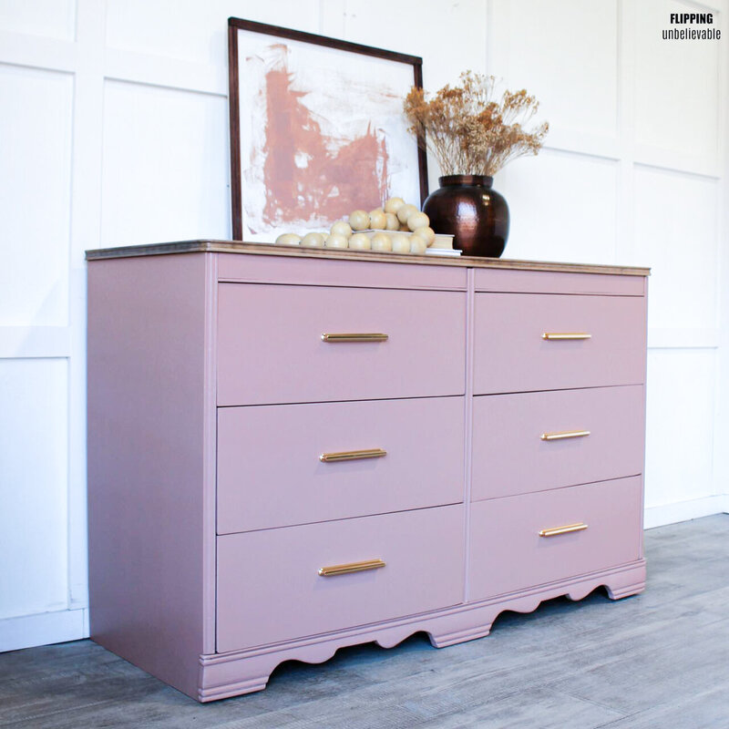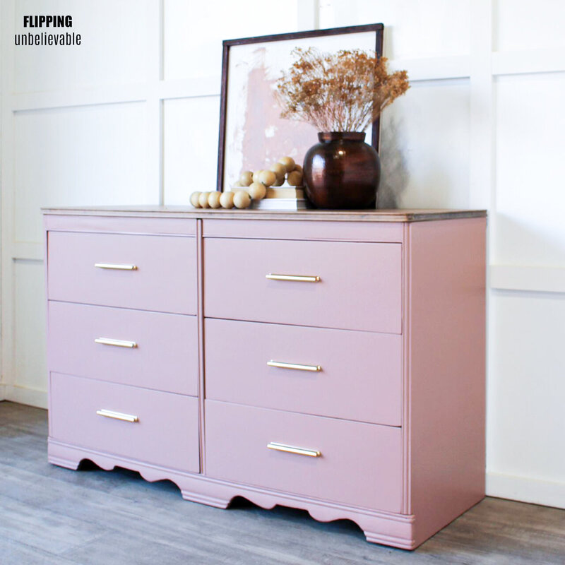 Transform your space with this stunning pink dresser, meticulously refinished to perfection by Flipping Unbelievable. Its soft blush hue exudes charm and sophistication, while the gleaming gold hardware adds a touch of opulence. Whether you’re looking for a timeless statement piece or have finally decided to fully embrace your “Barbie Era”, this beautiful dresser offers ample storage while bringing a touch of luxury to your home.