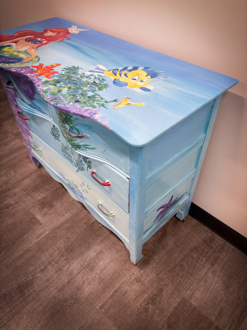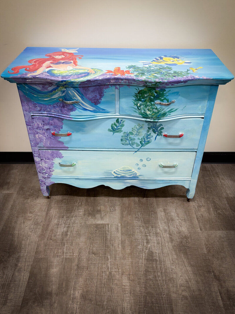 Dive into the enchanting world of The Little Mermaid with this antique dresser that's been transformed into a work of art! Imagine a mesmerizing underwater scene right out of the movie – Ariel, the spirited mermaid princess, Flounder, her faithful fish friend, and Sebastian the crab, all beautifully hand-painted on this vintage dresser.